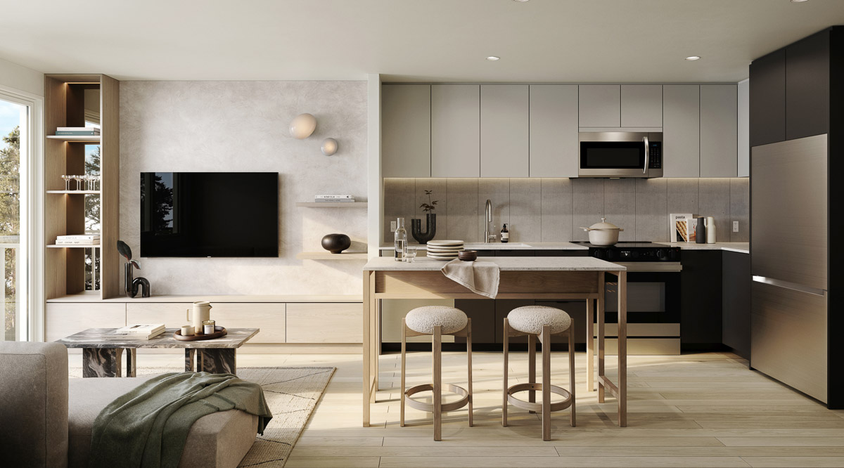 Bathed in natural light, your living area exudes warmth and calm, with finishes that complement the clean, contemporary millwork and soothing palette of the rest of the home.
