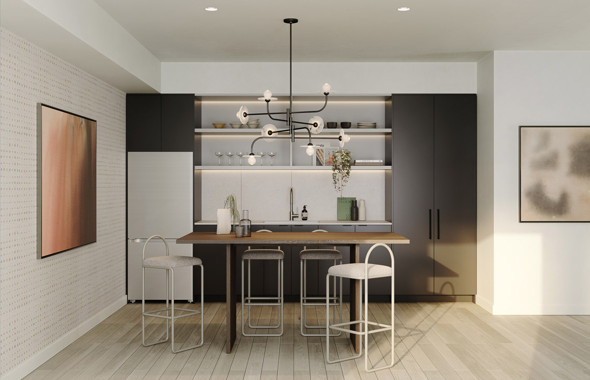 Bright and airy, experience a multi-use entertainment lounge connected to an outdoor patio space, and a kitchenette flooded with natural light, designed for social gatherings, celebratory moments, and turning neighbours into friends.